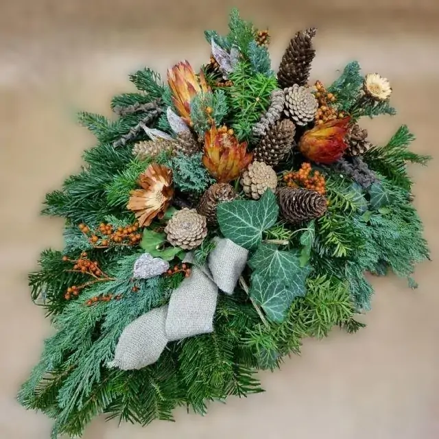 Bukett mit robuster Deko. Geeignet für jede Trauerfeier. Und als lang haltbarer Grabschmuck.
